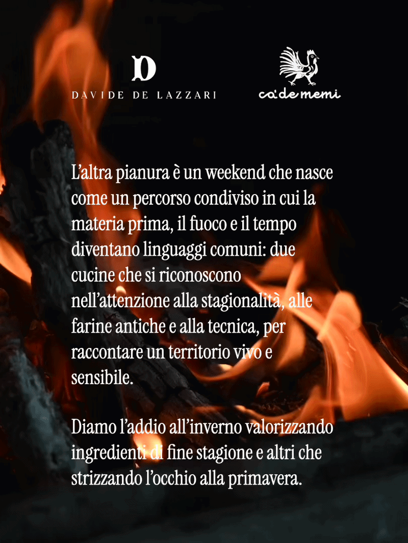 L’altra pianura è un fine settimana che nasce come un percorso condiviso in cui la materia prima, il fuoco, e il tempo diventano linguaggi comuni: due cucine che si riconoscono nell’attenzione alla stagionalità, alle farine antiche e alla tecnica, per raccontare un territorio vivo e sensibile.