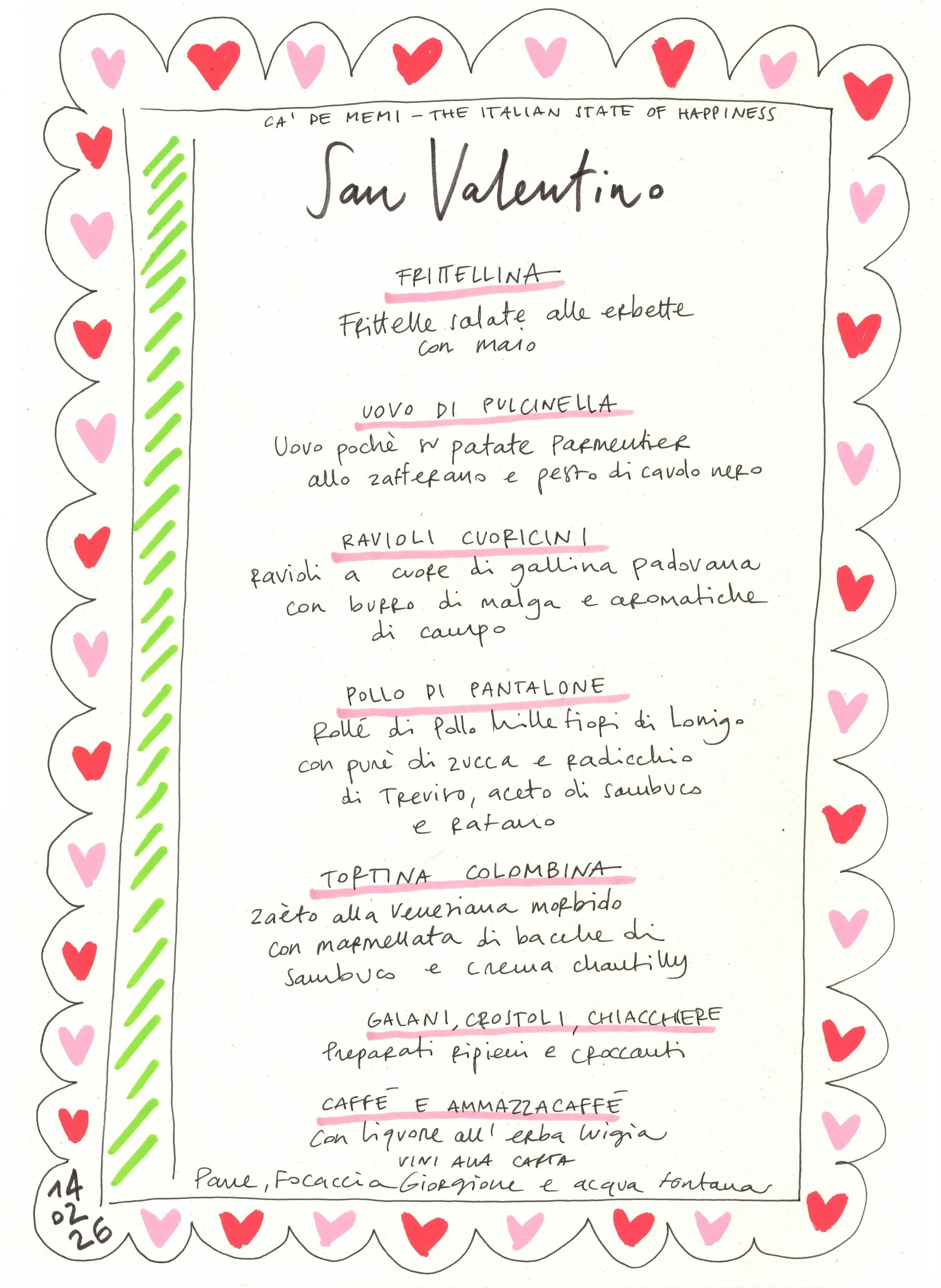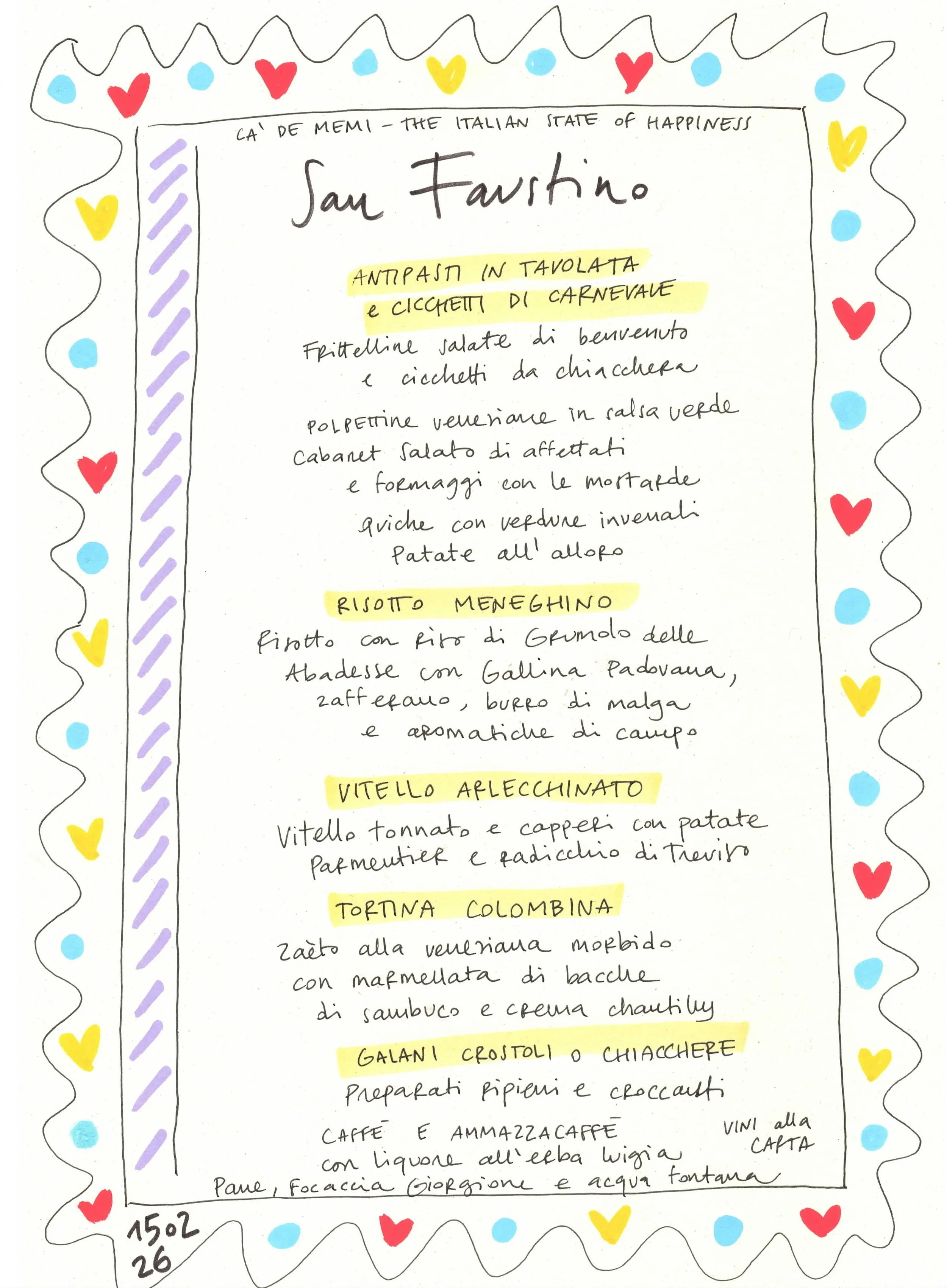 I nomi dei piatti strizzano l’occhio alle maschere della commedia dell’arte 🎭, per una celebrazione incrociata tra Carnevale, San Valentino e San Faustino.